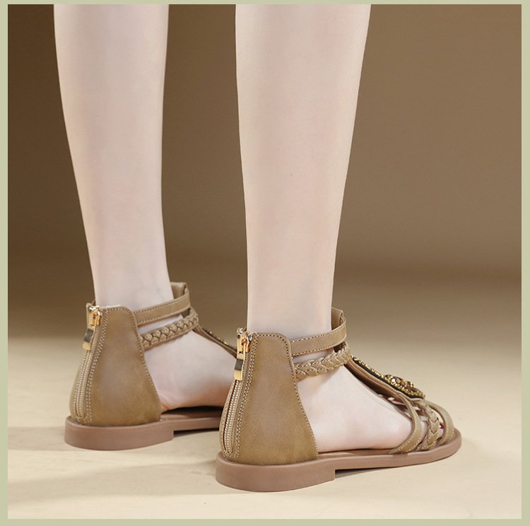 New 2025 Summer Sandals Women Bohemian Retro Beaded Zipper Rhinestone Roman Flat Sandals