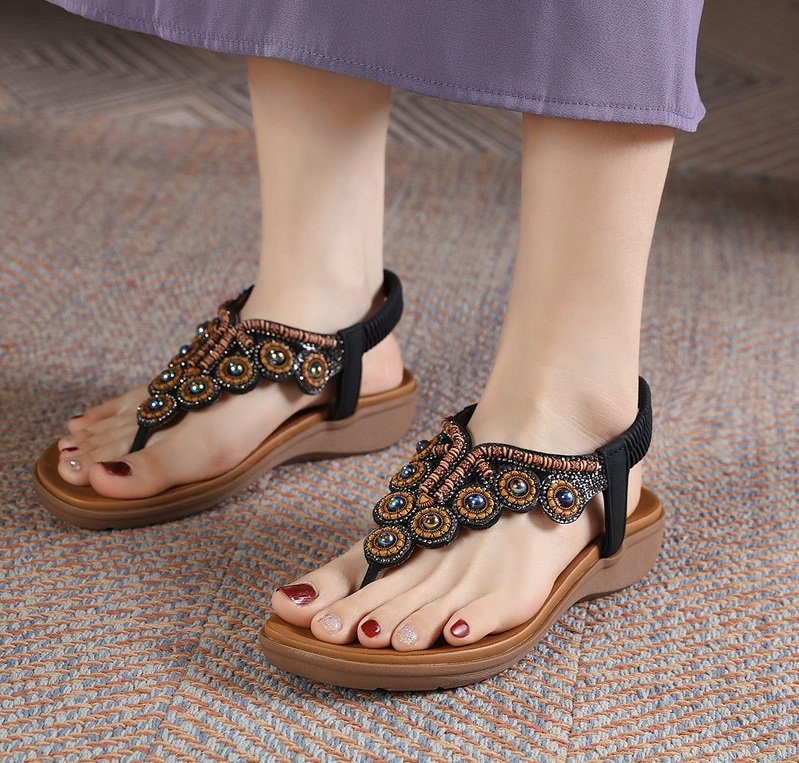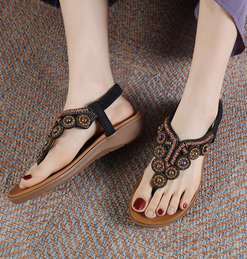 Summer New Bohemian Style Flip-Flops Beaded Rhinestone Buckle Elastic Heel Elastic Band Women’s Shoes